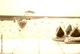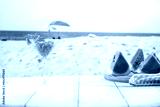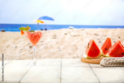 Fruits and drinks on the beach on a table with copy space for advertising - a holiday and resort theme for summer relaxation during the hot summer