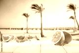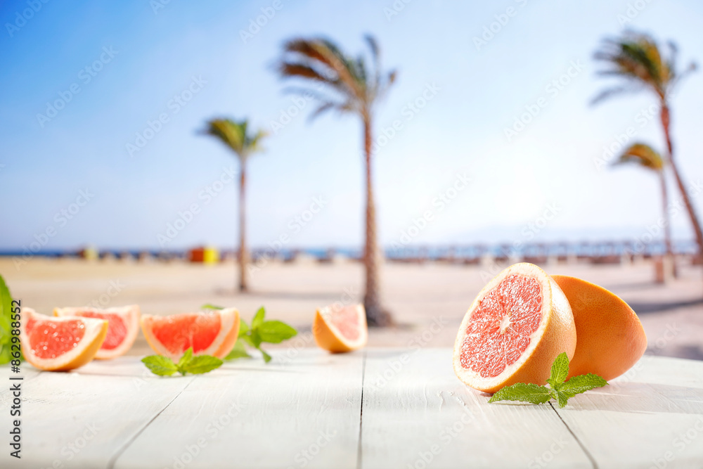 Fruits and drinks on the beach on a table with copy space for advertising - a holiday and resort theme for summer relaxation during the hot summer
