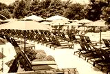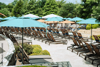 Turquoise and orange beach umbrella and row of grey pool lounge chairs at upscale hotel resort in Grapevine, Texas, lush greenery tree background in sunny sky, summer holiday vacation travel