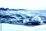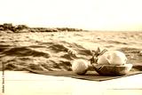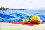 Fruits and drinks on the beach on a table with copy space for advertising - a holiday and resort theme for summer relaxation during the hot summer