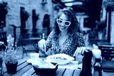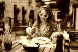 Portrait of a smiling woman eating pasta at cozy italian restaurant outdoors. Concept of italian cuisine and lifestyle. Travel, tourism, food and drink.