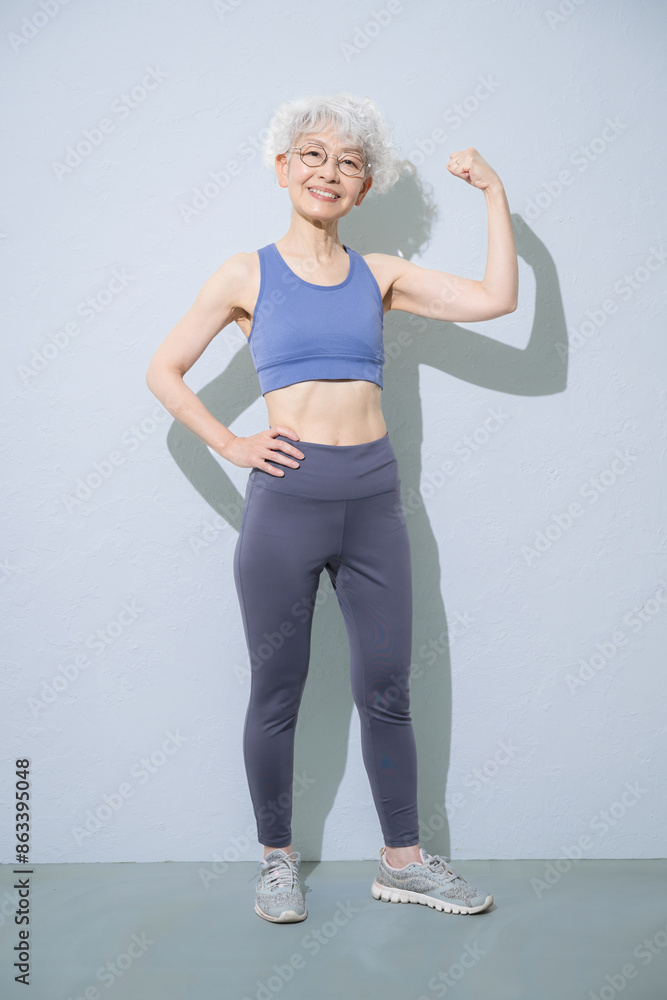 スポーツや運動、健康維持で使いやすい元気なアクティブシニア(高齢者)の筋肉がきれいなガッツポーズの全身 背景ブルー(水色)のカメラ目線 縦