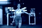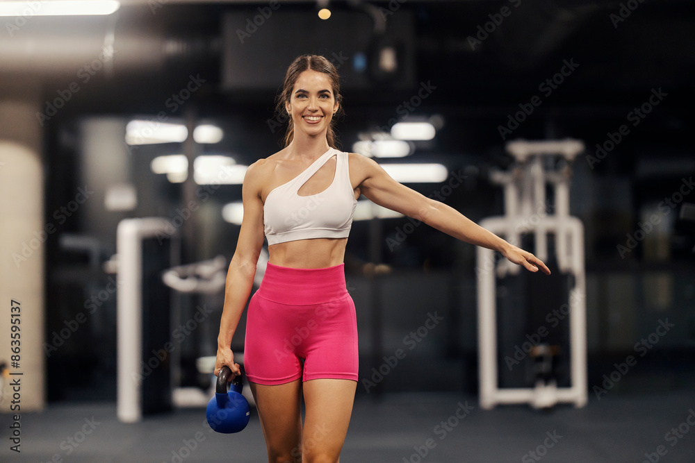 Portrait of smiling sporty active girl doing strength exercises with kettlebell in gym.