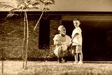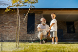 Happy child is watering lawn and tree in backyard with his grandfather.