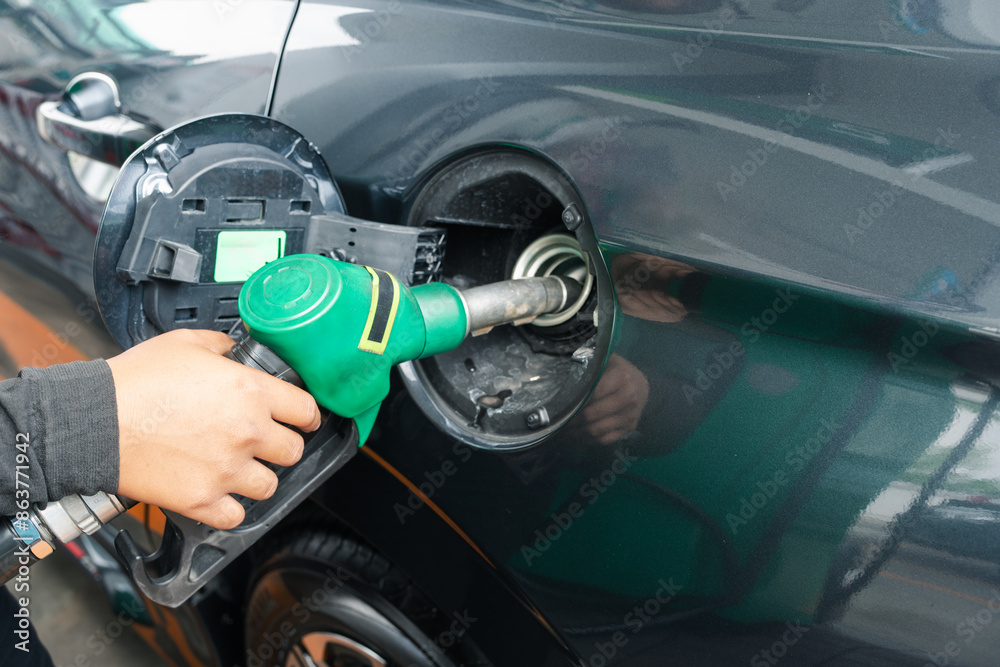 Unrecognizable man refueling car from gas station filling benzene gasoline fuel in car at gas station. Petrol high prices concept