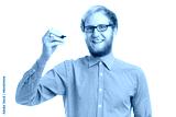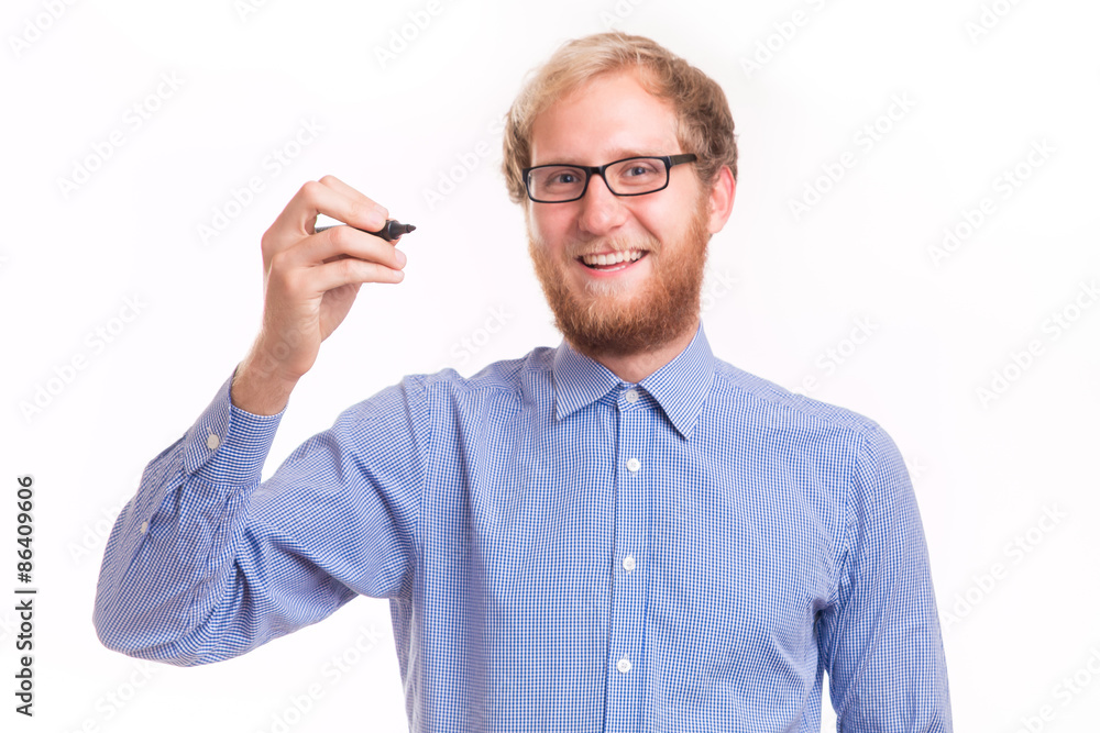 Young happy man writing on transparent board