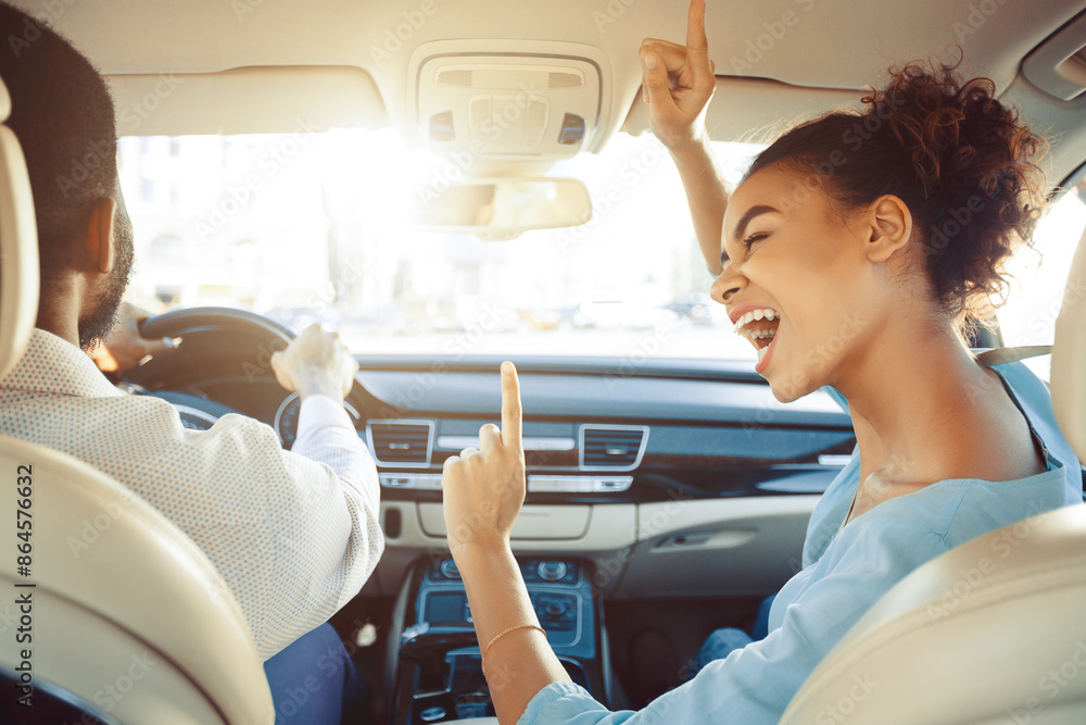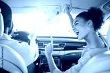 African American woman is enthusiastically singing along to the music in the passenger seat of a car. She is raising her hand in the air and has a big smile on her face