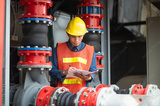 Asian engineer diligently inspects machinery in an industrial factory.Asian workers diligently inspect machinery with focused determination in industrial factories.