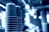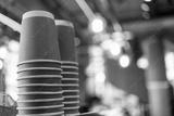 The stack of brown kraft cups stacked upside down on a shelf at the coffee shop