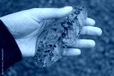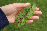 Gardener’s hands showing Red spotted cherry leaves with Coryneum Blight disease. Prunus avium tree with fungal disease