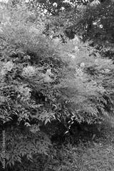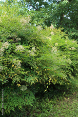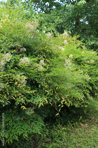 Two Nandina domestica bush in bloom in the garden on summer. Heavenly bamboo branch with white flowers