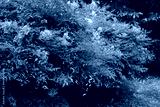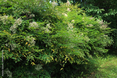 Two Nandina domestica bush in bloom in the garden on summer. Heavenly bamboo branch with white flowers