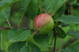 Close-up of small red and green Emperor Dallago apples growing on branch on tree. Malus domestica