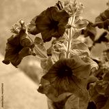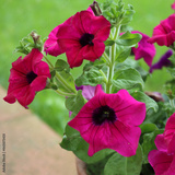 Surfinia plant in a terracotta pot in bloom with dark pink flowers on a terrace. Petunia × atkinsiana Surfinia Group