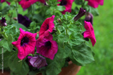 Surfinia plant in a terracotta pot in bloom with dark pink flowers on a terrace. Petunia × atkinsiana Surfinia Group
