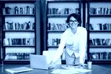 Young happy successful employee IT business woman she wearing glasses white shirt casual clothes use laptop pc computer stand near table work at office desk with pc laptop. Achievement career concept.