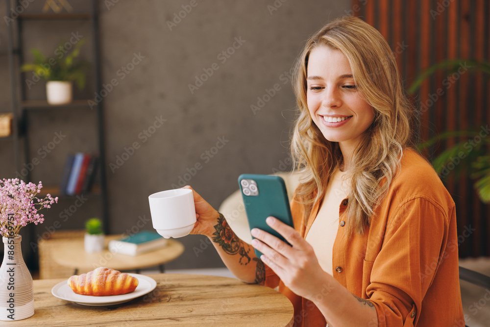 Side view young fun happy woman wear orange shirt hold use mobile cell phone drink coffee sitting alone at table in coffee shop cafe restaurant indoors work or study Freelance office business concept