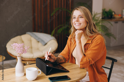 Young IT woman wears shirt hold use digital tablet pc computer use write draw stylus pc pen sitting at table in coffee shop cafe relax rest at restaurant in free time. Freelance mobile office concept.