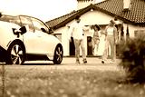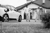 Happy Family Enjoying Time Together Near Electric Car Outside Modern Home