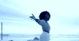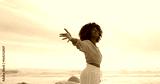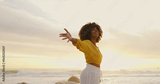 Sunrise, ocean and happy woman for freedom, vacation and holiday weekend in Miami with smile. Beach, african girl and carefree for adventure, peaceful and joy for sea breeze by scenic view outdoor