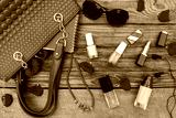 Things from open lady handbag. women's purse on wood background. Toned image.