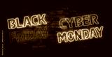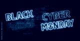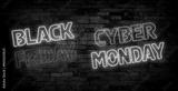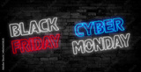 Black Friday, Cyber Monday banner. Hanging sale signboards on pink and blue bright background. Modern design with neon elements.