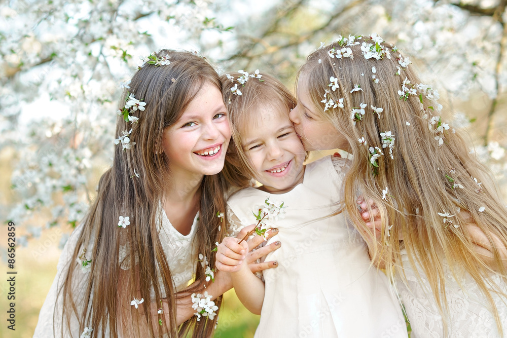 Portrait of little girls sisters in spring
