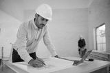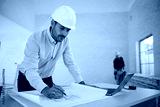 Building contractor analyzing blueprints at construction site.