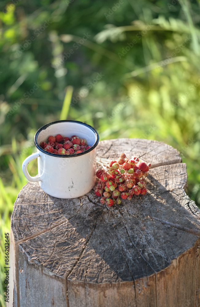 Enamel mug with ripe wild strawberries on tree stump, abstract natural background. picking red Sweet strawberries, organic healthy vitamins food. Summer berries harvest season