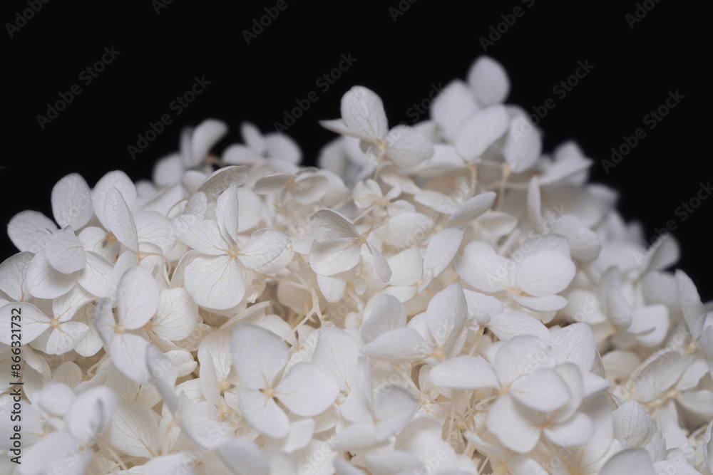 Hortensia hydrangea blooming white flowers bouquet on dark background macro