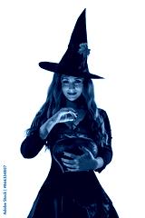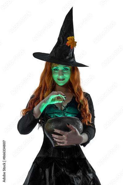 Witch on Halloween. Female wizard fairy character for All Saints' Day. Fantasy gothic red-haired Vampire girl in black dress. Enchantress dressed in carnival costume