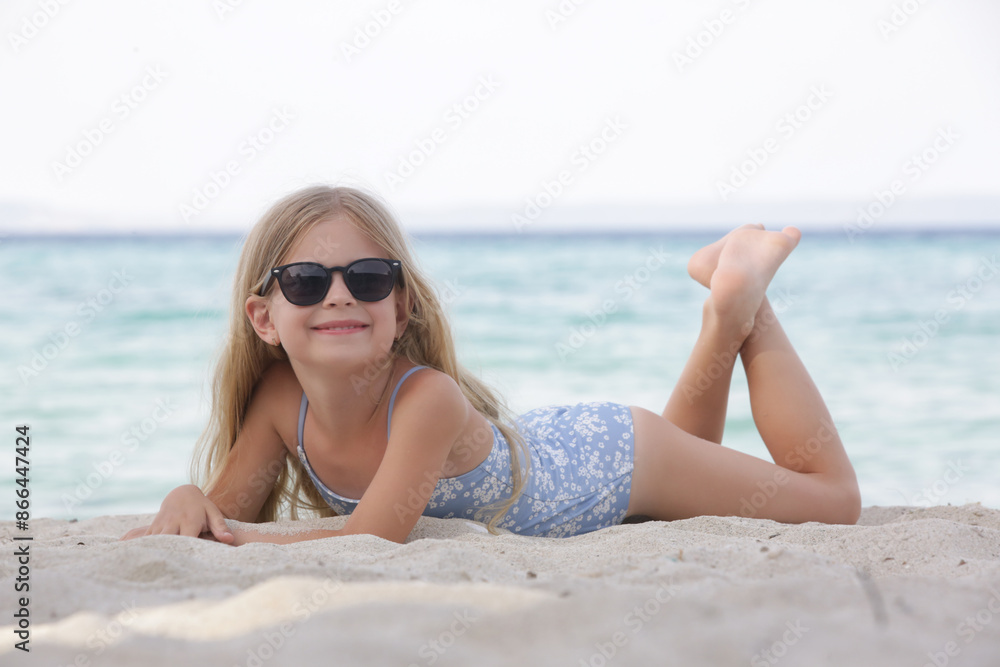 Adorable little girl in blue swimwear and black sunglasses on the sand beach