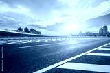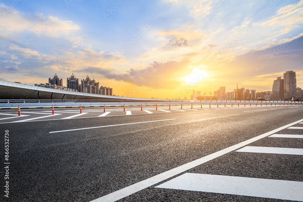 Asphalt highway road and city skyline with modern buildings at sunset. car background.