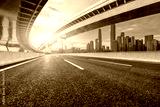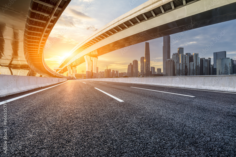 Asphalt highway road and bridge with modern city buildings scenery at sunset in Guangzhou. car advertising background.