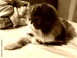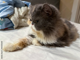Focus on plump, chubby cheeks of a tri colored Persian cat lying down on the bed alone in the bedroom.