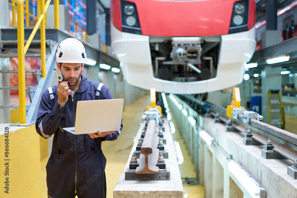 Engineer or worker working on laptop computer and talking on walkie talkie at construction train station