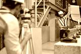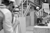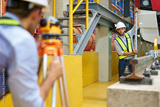 Worker or engineer using theodolite surveying optical instrument and coworker holding large ruler for measuring at construction train station
