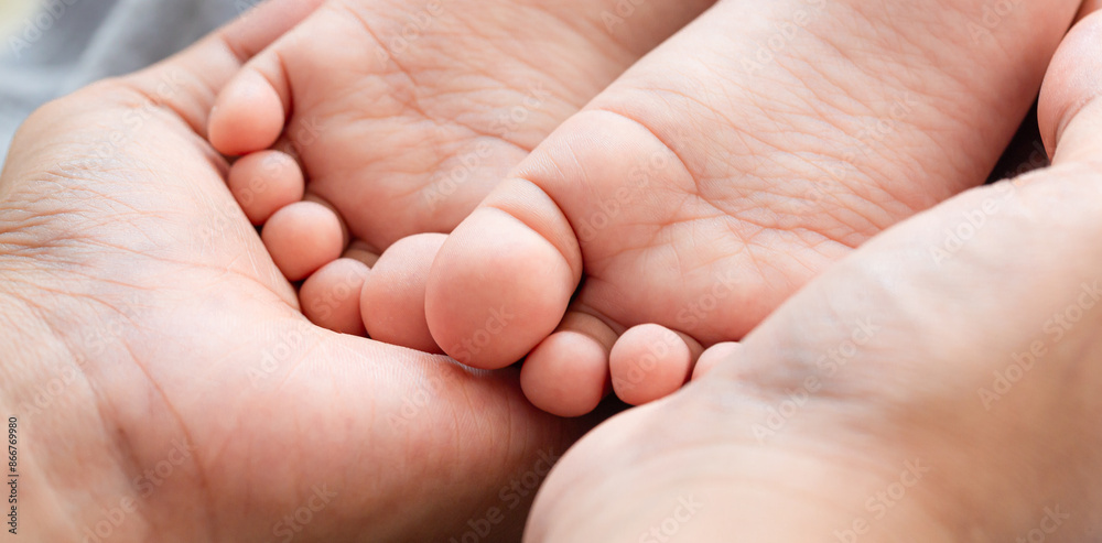 Baby feet,Baby feet in hands, mother, mother and her baby, happy family concept, beautiful conception image of childbirth.
