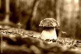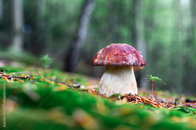 Ripe porcini mushroom in summer forest close up. King bolete mushroom in green moss