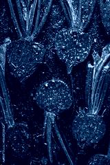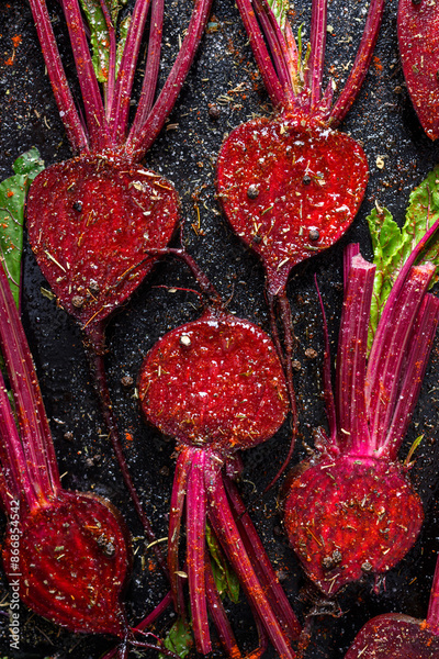 Juicy beet slices before baking in the baking oven. Top view. Cooking roasted beetroot with spices close up. Preparation of baked beets with olive oil, salt and pepper