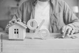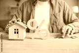 Wooden percent symbol and house model on table with crop young man counting coins in background. Real estate, finance, business, mortgage loan, mortgage interest rate concept