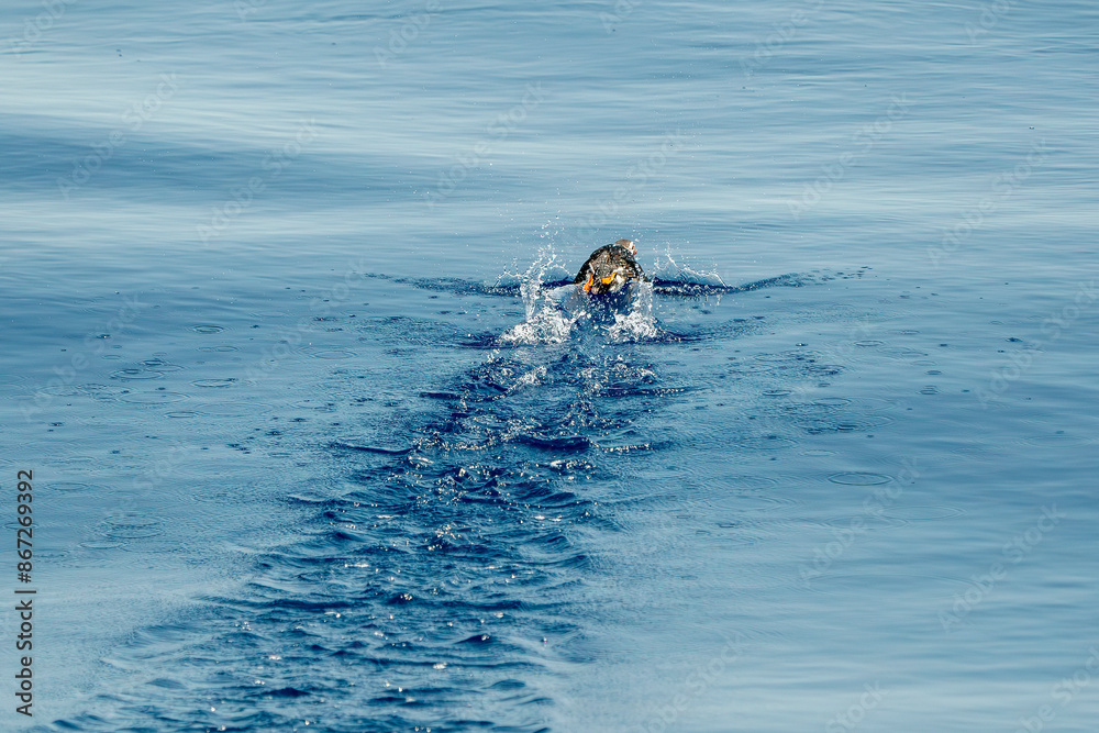 a puffin swimming in the blue sea, genoa, liguria, italy, very rare spotting in mediterranean sea, slow motion