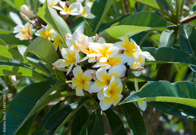 White and yellow plumeria flowers on tree