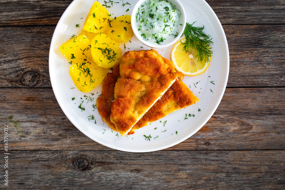 Crispy breaded seared chicken cutlet with boiled potatoes and cucumbers in cream served on white plate on wooden table