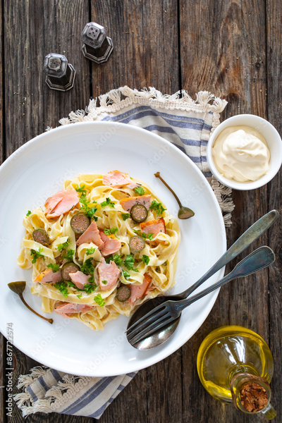 Parppadelle with salmon and mayonnaise served with caper on white plate on wooden table
