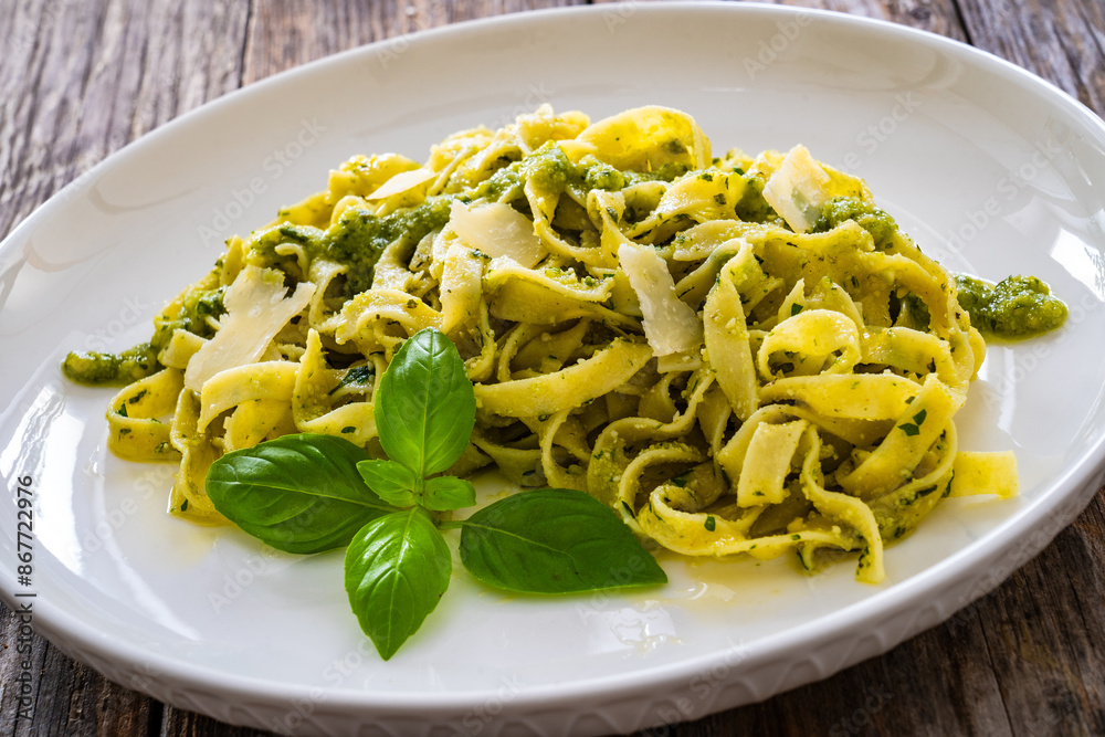 Pappardelle with basil pesto sauce sprinkled with grated Parmesan cheese served on white plate with spoon and fork on wooden table