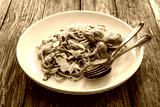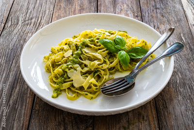 Pappardelle with basil pesto sauce sprinkled with grated Parmesan cheese served on white plate with spoon and fork on wooden table