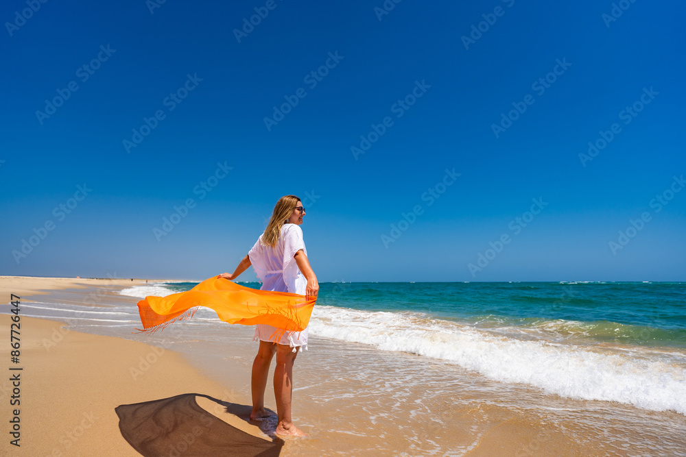 Summer vacation. Beautiful young woman in white tunic and sunglasses holding orange scarf fluttering in the wind standing on the sandy beach by the sea with big waves on a beautiful sunny day