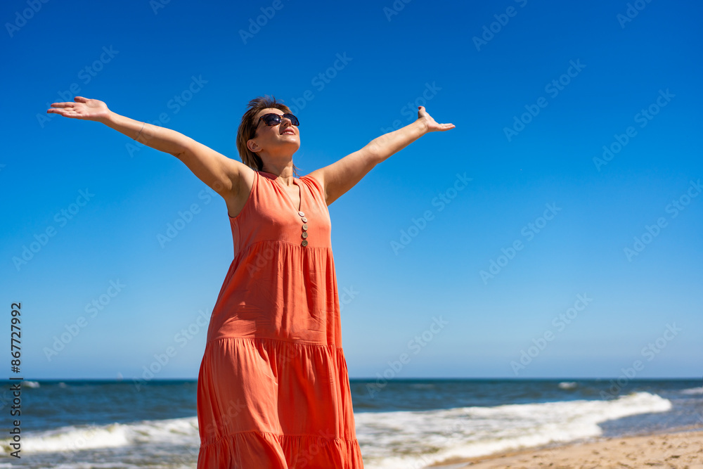 Summer vacation. Beautiful young woman in orange dress and sunglasses standing with her arms spread out on the sandy beach by the sea on a beautiful sunny day