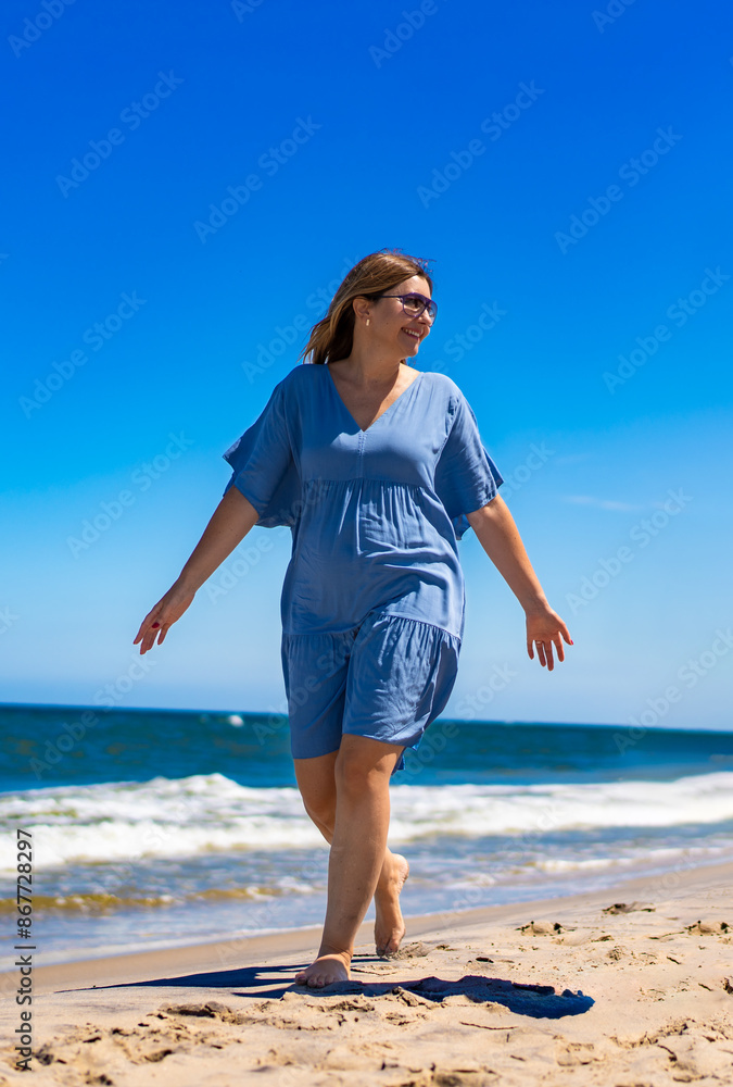 Beach vacation. Happy young woman wearing fashionable blue dress, walking on sunny sandy beach on windy day